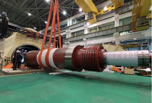 為了保障發電機轉子順利抽出,起吊人員和行車司機密切配合,發電機轉子隨著吊裝帶的緩緩移動,完好無損地從定子膛中抽出,在大家的默契配合與不懈努力下,整個過程有條不紊地進行,工作過程零失誤。