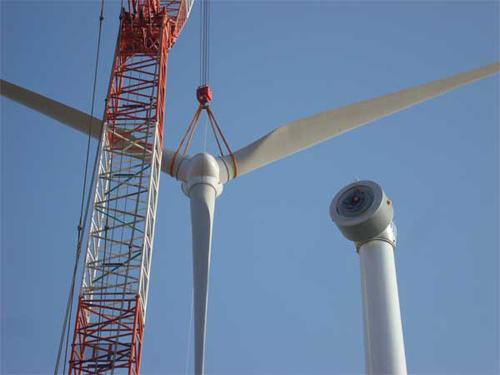火木梁風(fēng)電項(xiàng)目施工中遇到了很多的困難,在現(xiàn)場(chǎng)風(fēng)速高達(dá)12米每秒的情況下,采用“分體吊裝”技術(shù),利用履帶式起重機(jī)和巨力吊裝帶作為主力吊裝機(jī)具和吊裝索具,機(jī)架、傳動(dòng)鏈作為獨(dú)立吊裝模塊,在100米高度完成機(jī)艙空中組裝,開創(chuàng)了國(guó)內(nèi)100米以上輪轂高度分體吊裝風(fēng)機(jī)的先河。
